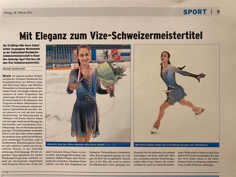 Eiskunstlauf: An den Schweizereisterschaften im Eiskunstlauf gewinnt Mila Grace die Silbermedaille in der Kategorie U15 Mädchen. Die KuSs ZO gratuliert herzlich zu diesem Erfolg!